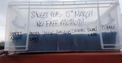 Sweet peas in storage boxes. The Higgledy ‘no faff’ method.