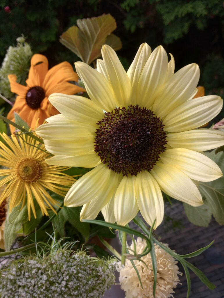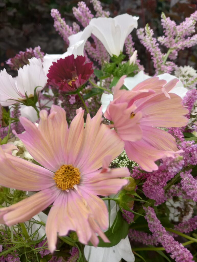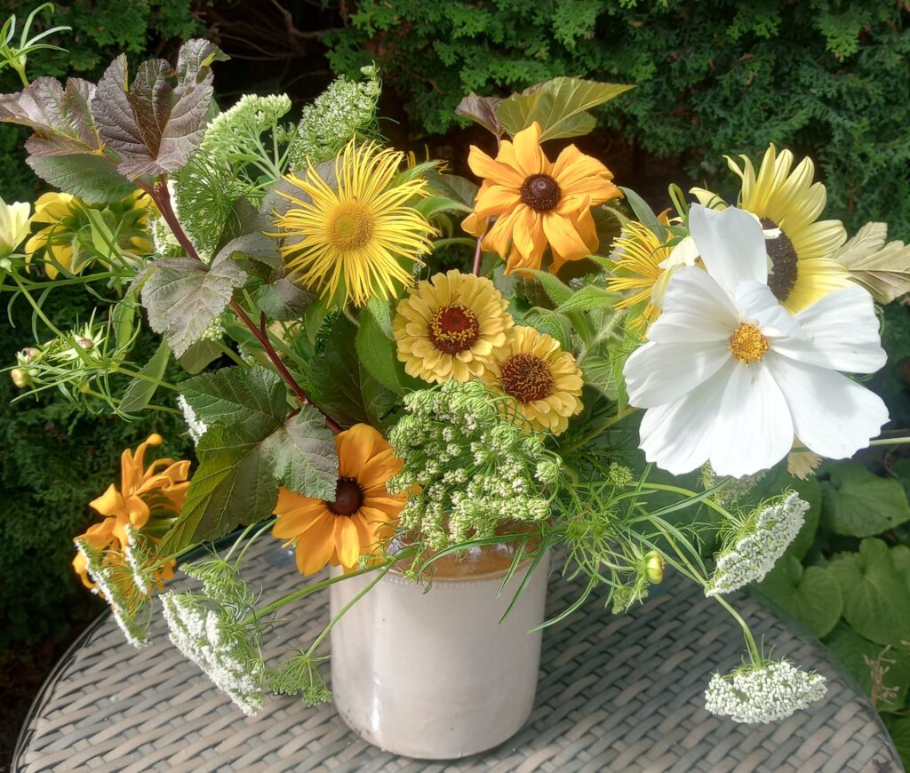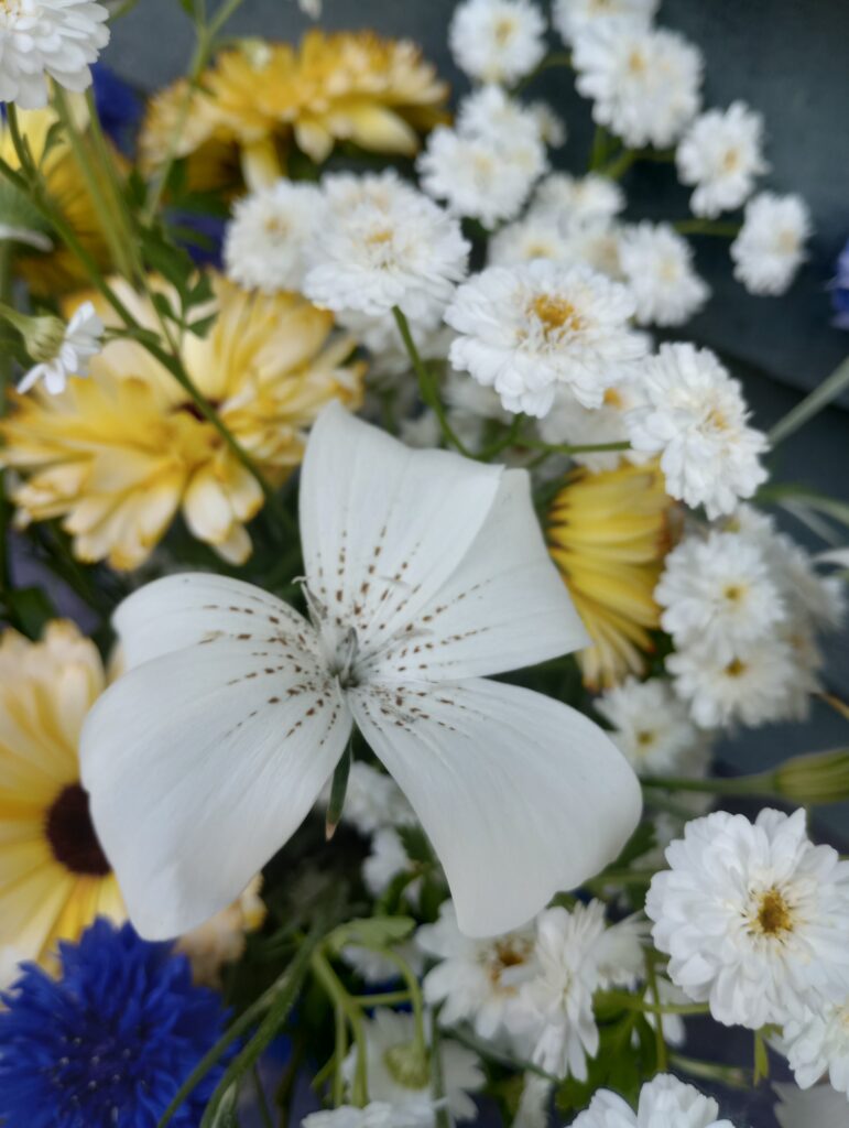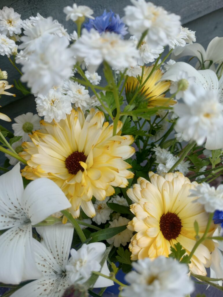 I love a blue and yellow combo, and the stars of this arrangement is the beautiful Cornflower ‘Blue Ball’, with Calendula ‘Snow Princess’, Corncockle ‘Bianca’ and double Feverfew.