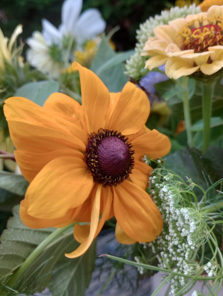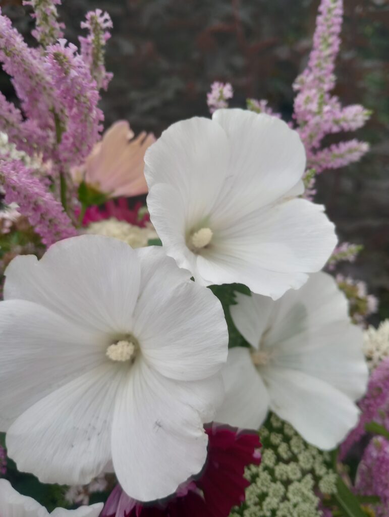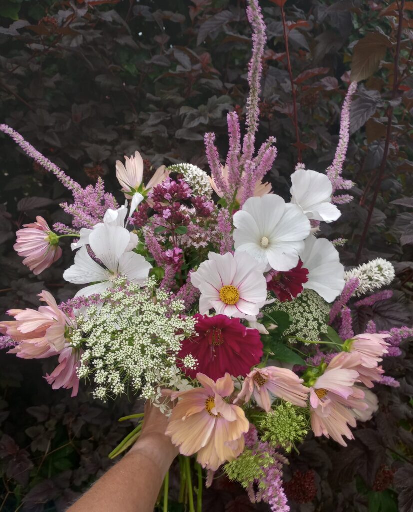 One of the most unusual flowers that I’ve used in arrangements this year has been Bupleurum longifolium ‘Bronze Beauty’ which I used in a couple of different arrangements. Here it is with Alchemilla mollis, Corncockle ‘Bianca’ the gorgeous white Corncockle (hopefully we will be bringing that into the shop in the new year), Feverfew and Cornflower ‘Black Ball’.