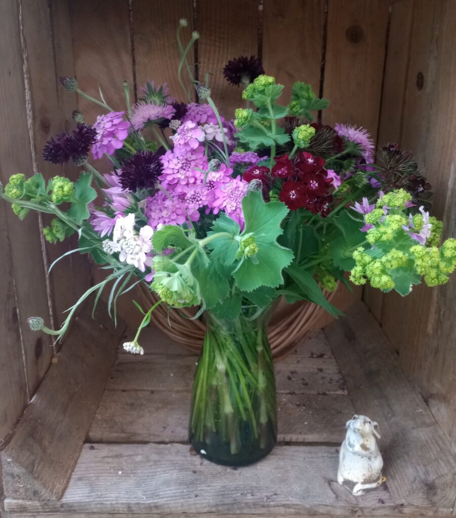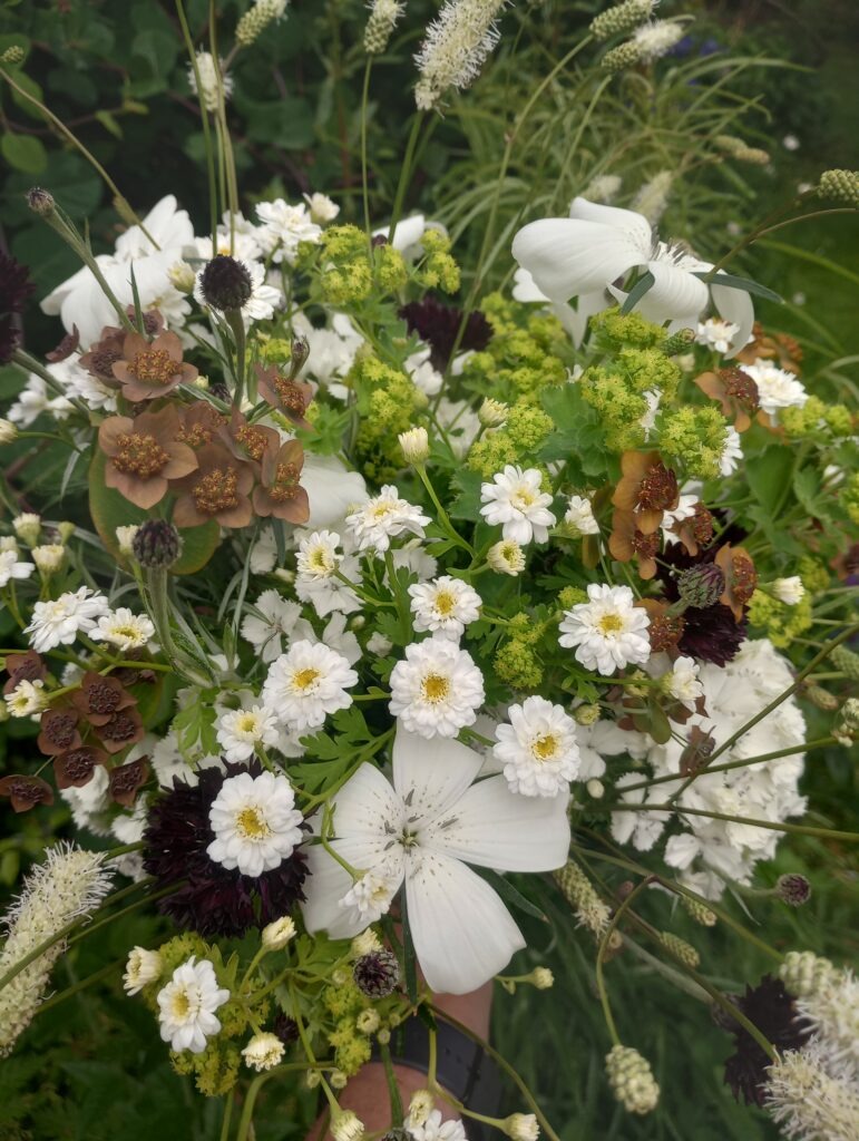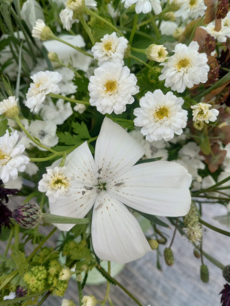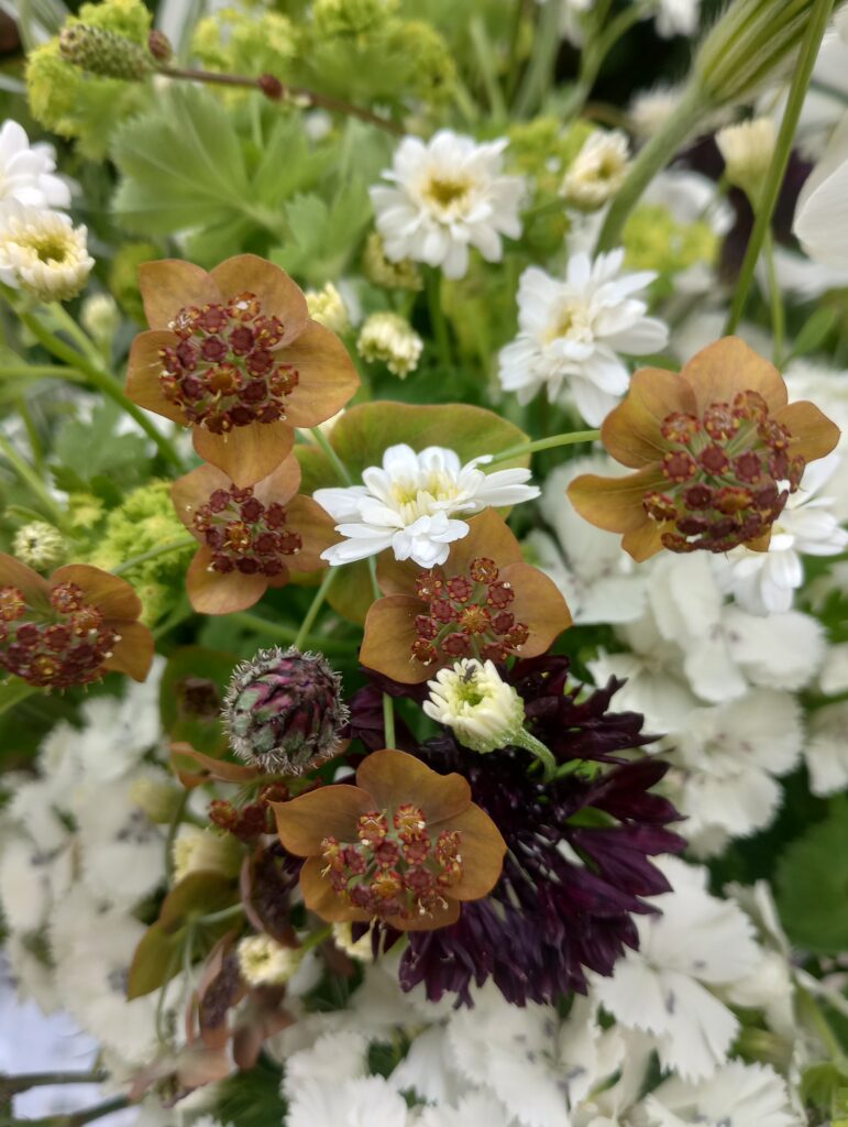 One of the most unusual flowers that I’ve used in arrangements this year has been Bupleurum longifolium ‘Bronze Beauty’ which I used in a couple of different arrangements. Here it is with Alchemilla mollis, Corncockle ‘Bianca’ the gorgeous white Corncockle (hopefully we will be bringing that into the shop in the new year), Feverfew and Cornflower ‘Black Ball’.