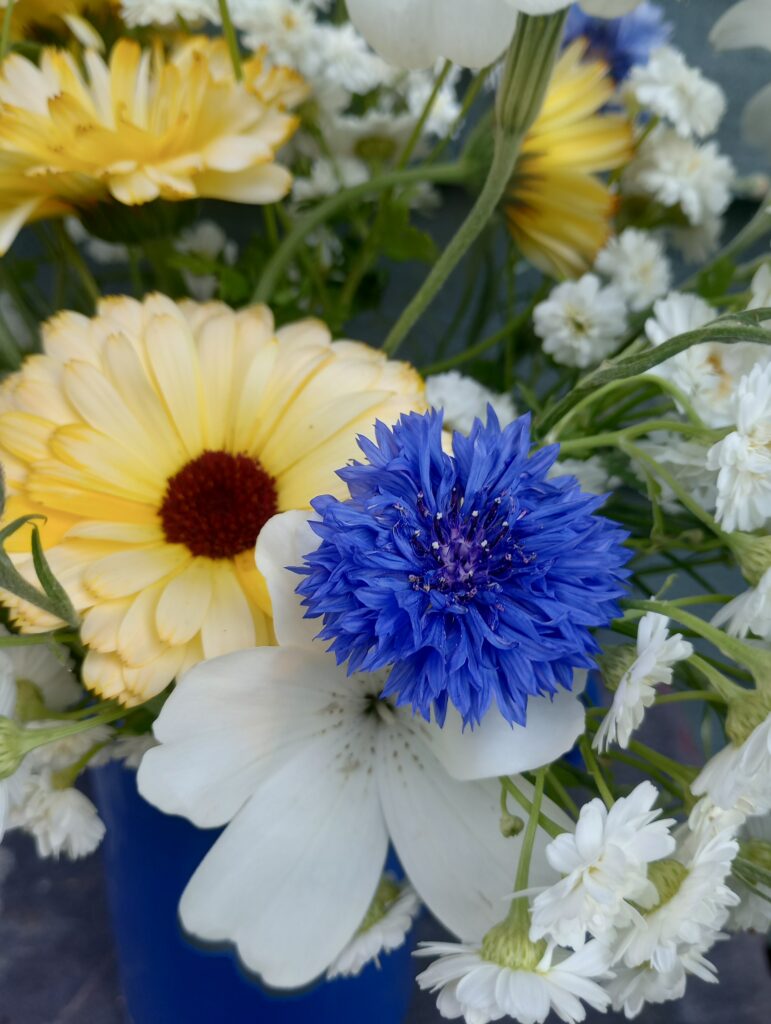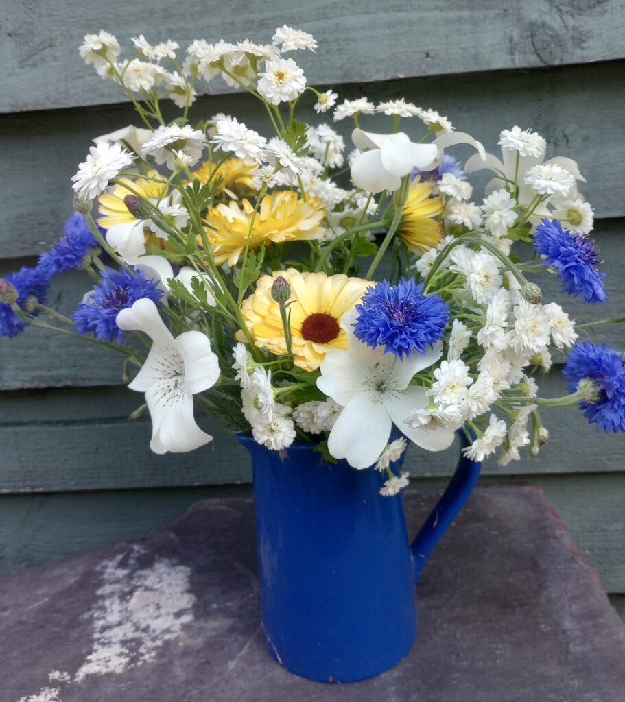 I love a blue and yellow combo, and the stars of this arrangement is the beautiful Cornflower ‘Blue Ball’, with Calendula ‘Snow Princess’, Corncockle ‘Bianca’ and double Feverfew.