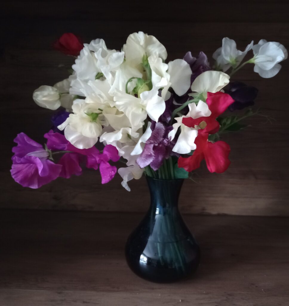 Sweet peas are not massively long-lived in a vase but they are so floriferous that the next picking will be ready as those are going over so its not a problem. If you really want to try and extend the time in the vase pick them when the first one or two flowers are out but the bottom flowers aren’t quite yet.