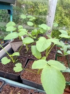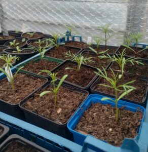 The Zinnias and Sunflowers are on the windowsill in my front bedroom and they are just starting to germinate now. They will get moved out into the greenhouse as soon as they have germinated as there is much better light in the greenhouse and I don’t want them to get too leggy. But that is also why I have the fleece on hand for the cold nights that we have had recently, including quite a hard frost last week. It just gives some extra warmth to my Cosmos seedlings and Tomato plants. There is a lot of juggling of stuff to make space for the new seedlings, anything hardy can be hardened off and brought outside now.